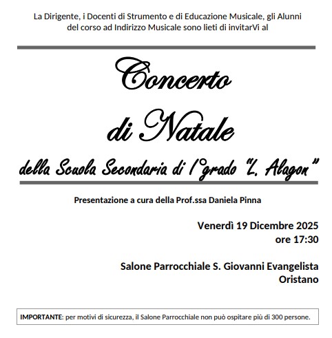 Si comunica che la Scuola Secondaria di I grado “L. Alagon” di Oristano organizzera per il giorno 16 dicembre 2025 dalle ore 16:00 alle ore 18:00 l’evento “Scuola Aperta - Open Day”